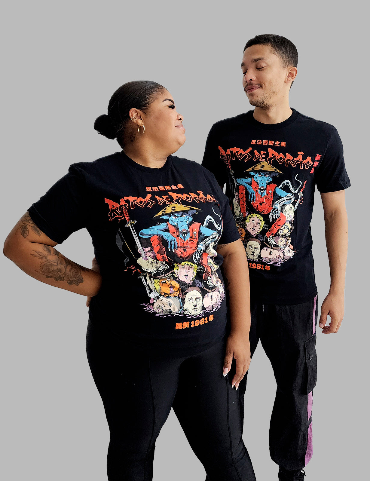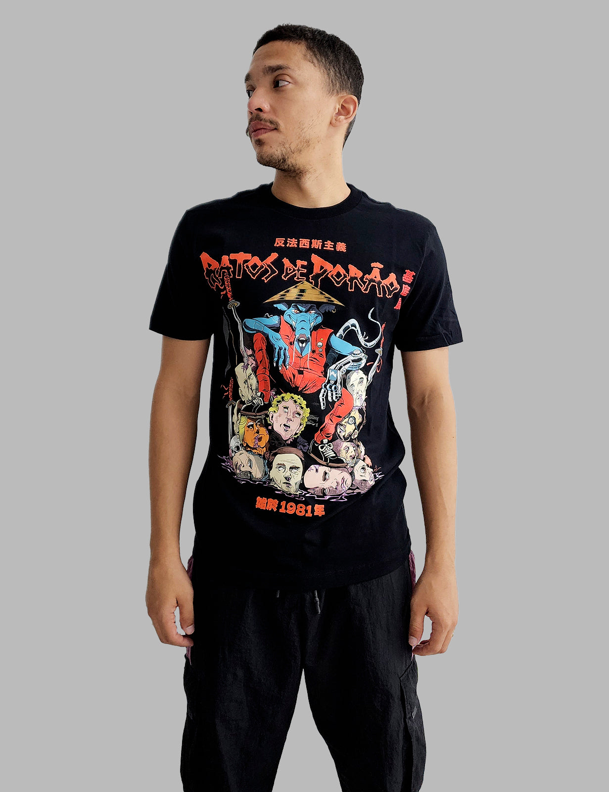 A estampa reproduz a icônica arte da estátua de Justiça despedaçada, símbolo de rebeldia, crítica social e força musical.