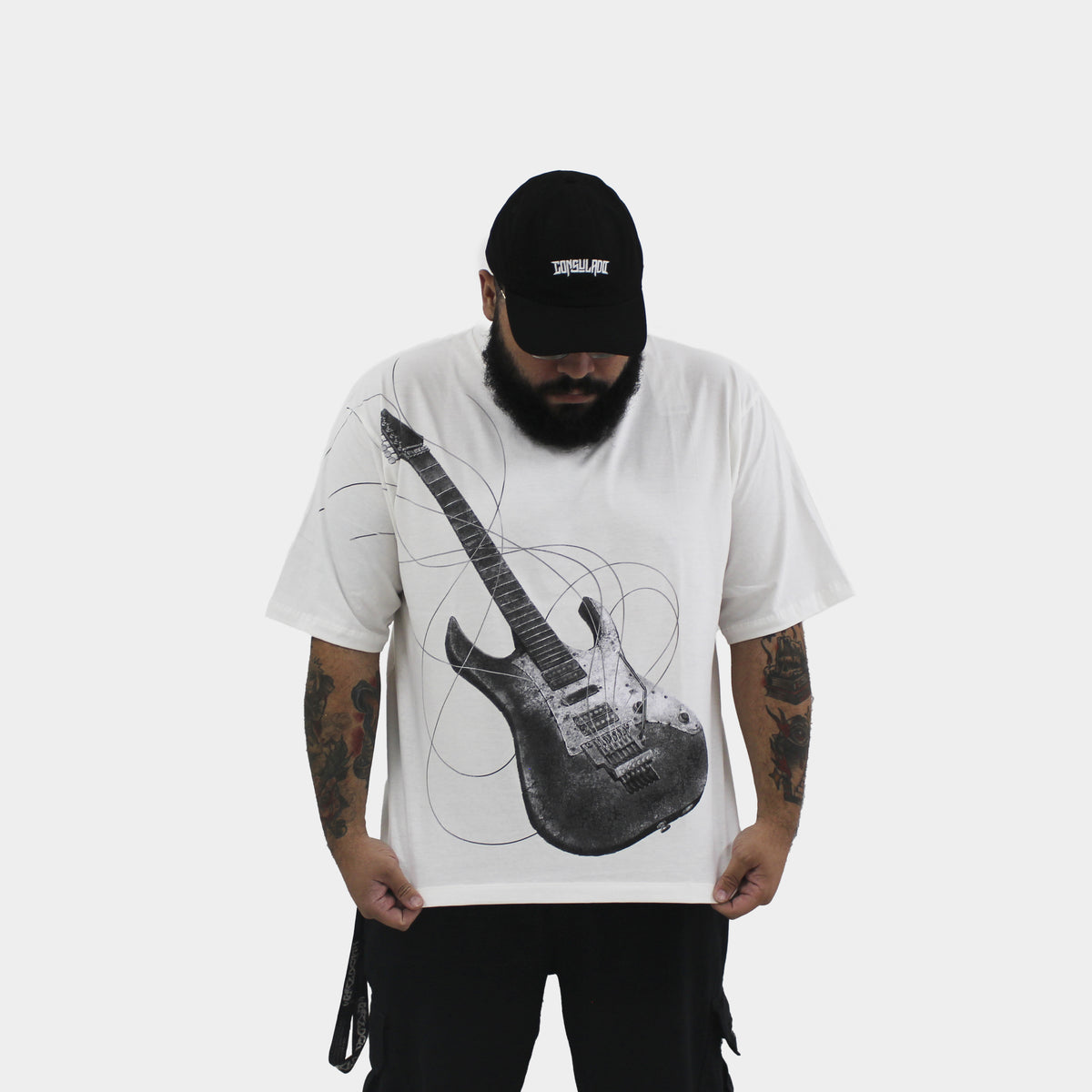A Overtown Guitar traz o poder da guitarra estampado em uma peça oversized com caimento perfeito, feita para quem vive a música dentro e fora do palco.