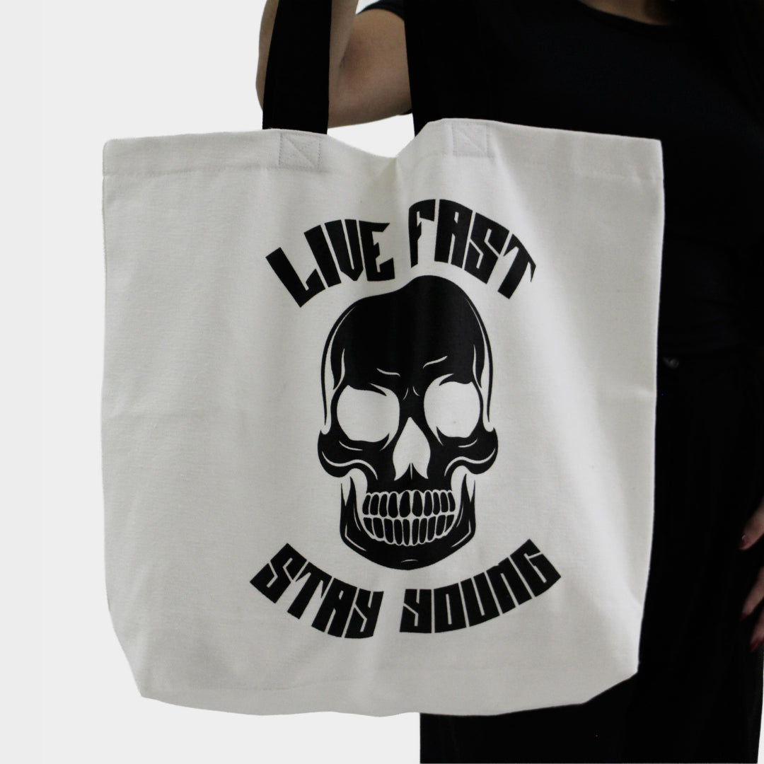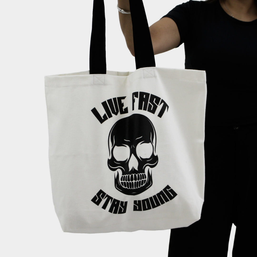 A ecobag Live Fast Stay Young é resistente e sustentável, perfeita para o dia a dia de quem busca praticidade sem abrir mão do estilo consciente.